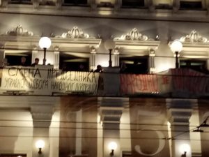 Dva nepoznata muškarca, koji su svoj identitet prikrili kapuljačama i medicinskim maskama, rano jutros su skinuli transparent sa ograde između Jaćimovićevog šatora i zgrade Banovine.