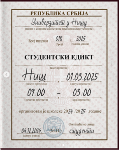 Studenti u blokadi najavili su danas, na svojim kanalima komunikacije, veliki protest 1. marta u Nišu. Evo šta su napisali: „Edikt je odluka koja donosi nova pravila. Sada studenti Srbije donose svoj – Studentski edikt, poruku da više nećemo prihvatiti nepravdu, korupciju i neefikasan sistem koji nas ograničava. Neki tragovi blede, a neki postaju deo […]